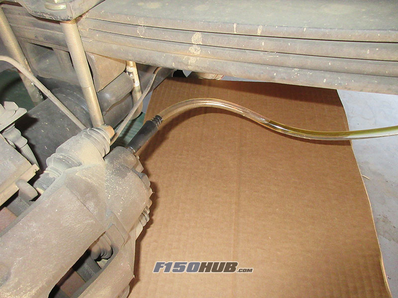 • Locate the bleed valve on the brake caliper furthest from the brake master cylinder (passenger side rear brake). Attach the bleeding apparatus hose to the bleed valve on the brake caliper.