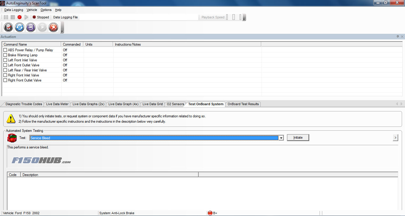 • A special procedure is required if the ABS hydraulic control unit is being replaced. A "service bleed" is required as air will remain trapped in certain cavities of the HCU. A scantool with this functionality (such as AutoEnginuity, shown) is required to perform this procedure. Note that this is not required unless the HCU has been replaced. After completing the service bleed, re-bleed the system using conventional methods to ensure all air is removed from the brake lines. For more information about the service bleed, refer to your scantool literature as the feature is initiated differently with each device.