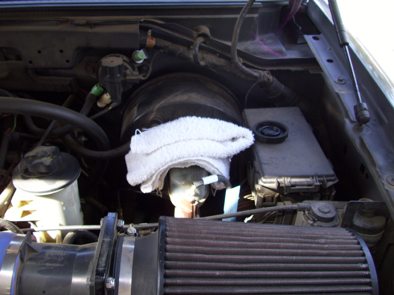 • Remove the cap from the master cylinder reservoir and place a rag over it. This is necessary because the system cannot be pressurized when the caliper pistons are being depressed into the caliper (future step). The rag will catch any fluid overflow and protect debris from entering the reservoir.