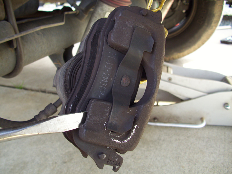 • The inner pad is also held in place by a three pronged clip that seats inside of the caliper piston - it just pops out with a little force.