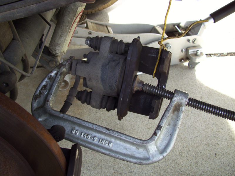 • Using a large C clamp or brake caliper tool, force the piston back into the caliper (this is why we removed the master cylinder cap earlier). Use a block of wood, metal, or even one of the old brake pads over the pistons to distribute the pressure over both pistons as well as protect them (they are made of plastic and can easily crack). Do this until the piston is recessed in the caliper and no longer protruding(see picture at left) or you will not be able to slide the caliper over the new brake pads.