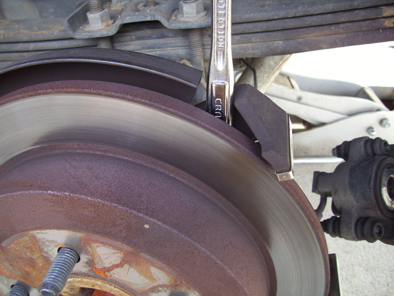 • Remove the old brake rotor. The emergency brake must be released for this to occur. If the rotor is stubborn, pry it off by wedging the handle of a socket wrench or breaker bar between the rotor and the caliper bracket. The drum brake mechanism for the emergency brake often causes enough friction that it does not slide off freely. If needed, persuade the drum with a sledge or dead blow hammer (tap it 360 degrees while applying pressure, do not attempt to pound it off).
