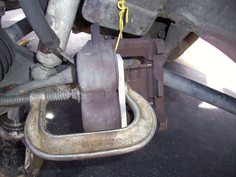 • Use a large C clamp or brake caliper tool to force the piston into the caliper. This can be done with the inner brake pad still attached, as pictured.